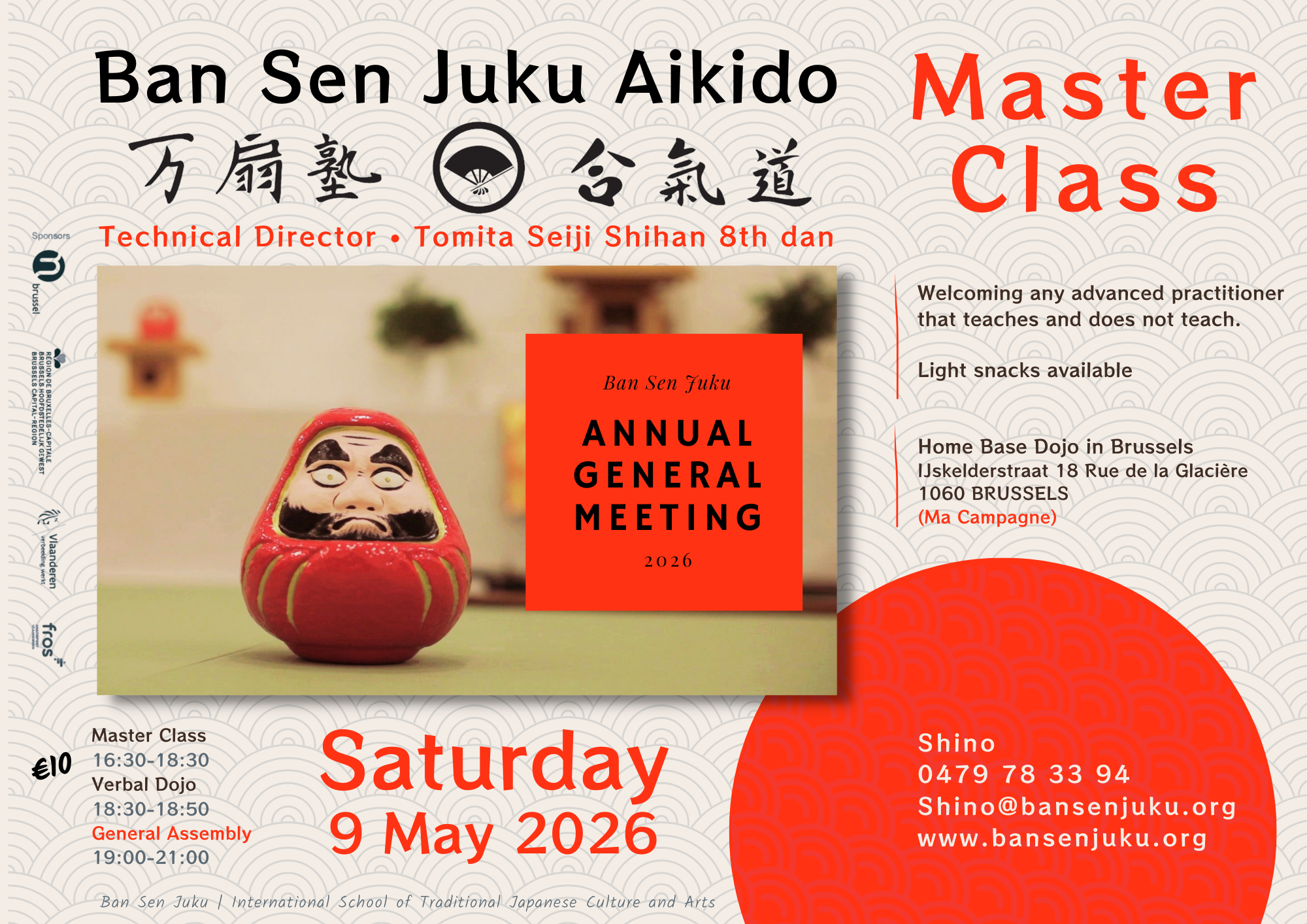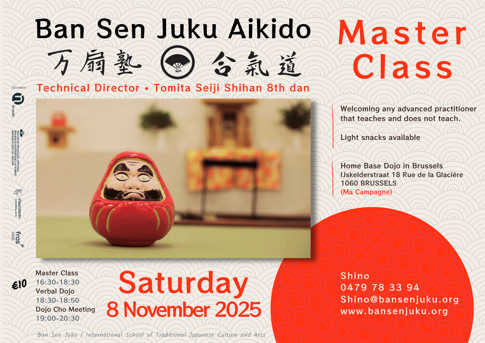 The aikido seminars and traditional Japanese arts workshops are open to all levels of practitioners and newcomers. Only the master classes require an appropriate level.